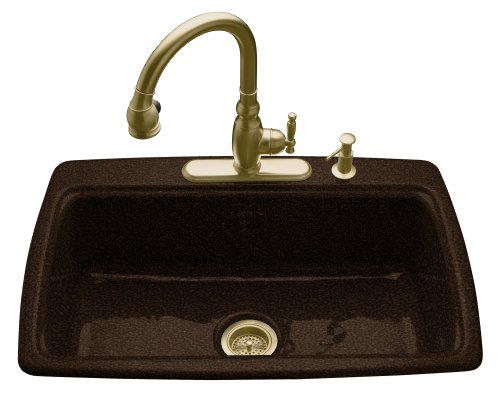 FeaturesOffers a functional alternative to the traditional double-basin kitchen sink33"L x 22"WConstructed KOHLER(R) Cast IronBasin depth: 9"Single-basin design Kohler K-5863-3-KA Cape Dory Self-Rimming Kitchen Sink with Three-Hole Faucet Drilling, Black 'n Tan?