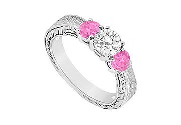 #A brilliant-cut round diamond is set between two subtle pink sapphires. The band is intricately designed in 14K white gold. This three stone ring has a total weight (TGW) of 0.33 ct.