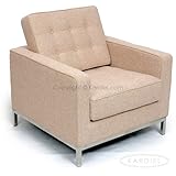 Kardiel Florence Knoll Style Arm Chair, Aureo Crema Houndstooth TwillThe Florence Knoll Sofa, Chair and Loveseat is a design icon. The original design was conceived in 1956 by Florence Knoll, a world class architect and designer. It is a relatively simple design as it was originally meant to complement the classic innovations of Saarinen and Bertoia. The Knoll philosophy of furniture design solves practical and aesthetic design problems. The philosophy results in minimalist beauty, lasting durability and luxurious comfort in one complete package. It is well known that Knoll studied and collaborated with Mies Van Der Rohe. Knoll designed the classic trio using a durable stainless steel frame with minimal materials. Cubic cushions featuring compressed buttons in a purposeful and logical layout provide style and comfort to the supporting thin armed, minimalist frame. Do you notice the similarities in design philosophy to the Mies Van der Rohe's Barcelona Chair? The Knoll Sofa, Loveseat, Chair and ottoman is becoming even more popular as its minimalist yet functional design fits perfectly into today's modern home. This stunning reproduction of the Florence Knoll 1956 Sofa Set is a Kardiel signature reproduction. Created with the highest accuracy to detail you can have your own version of one of the most influential designer icons of the 20th century. Originally meant to complement the classic innovations of Saarinen and Bertoia, the style perfectly compliments todays modern home. From the traditional hardwood box frame construction to the Premium Houndstooth Twill, you will not find a higher quality reproduction of the Florence. Available in individual pieces or the entire Sofa, Loveseat, Chair and ottoman set.