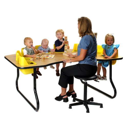 8 Seat Toddler Activity Table You can hold court in your own little Camelot when you've got your knights and damsels busy at work in the 8 Seat Toddler Activity Table. Molded plastic seats that are integrated into the top of a sturdy, wood-laminate table let you conserve space and sanity while you keep 16 little hands busy where you can see them. Each removable seat is molded from easy-to-clean polyethylene and features a safety belt for added security. Heavy, tubular steel legs can be fixed at either 14 or 27 inches high, depending on the needs of your institution. Both the chairs and tabletop are available in your choice of colors. These seats are recommended for children ages 5 to 24 months. About Toddler Tables Almost 30 years ago, Toddler Tables founder and church minister Glenn Holland got to work in his garage to fix a problem that he saw every Sunday. He noticed that parents with young children spent more time holding their children than they did being involved in the congregation. With an idea in mind, he set out using the best materials and production methods available to help care for the children and assist the parents in his congregation. Holland's hard work paid off when he developed the first Toddler Table. With the seat mounted into the top of the table, he was able to provide caregivers with more flexibility in their jobs, and gave the children a safe and comfortable way to interact with other children. Before long, Holland's new product began making waves in the child care industry, and what was once being built in a garage is now produced in the Toddler Tables manufacturing facility in Raleigh, North Carolina. Toddler Tables has become a symbol of commitment to the child care industry, and even though they've grown beyond Holland's garage, their attention to safety and quality are still available to every preschool, Sunday school, and daycare that cares just as much a